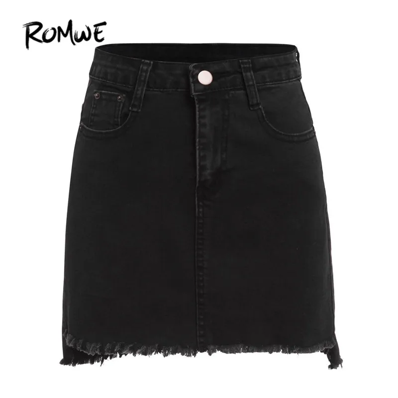 Beste Koop ROMWE Herfst Mini Rokken Casual Rokken Voor Vrouwen Plain Black Met Zakken Boven Knie Denim Bodycon Rok Goedkoop