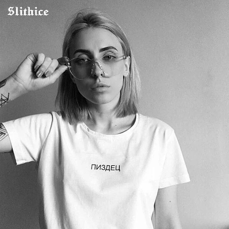 Kopen Goedkoop Slithice 2018 vrouwen T shirt Katoenen Shirts Tees Russische Brief Print Casual Zomer Vrouwelijke T shirt Tops Korte Mouw Wit Zwart Prijs