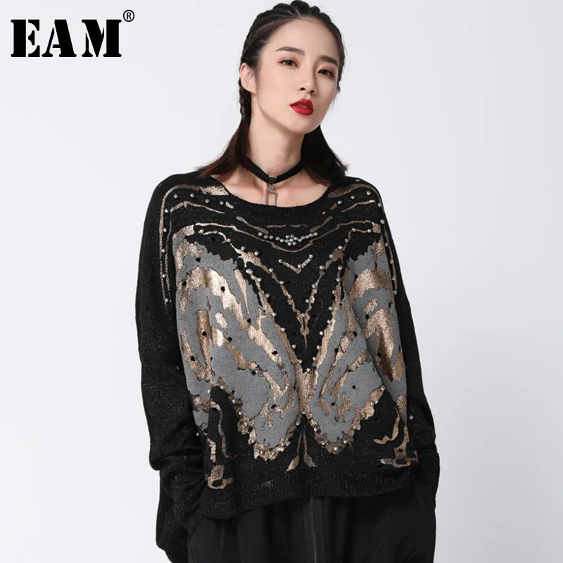 Beste Kopen [EAM] 2018 Nieuwe Herfst Winter Zwart Patchwork Losse Volledige Mouw O Kraag Trui Vrouwen Mode Tij Kralen Trui OA872 Goedkoop