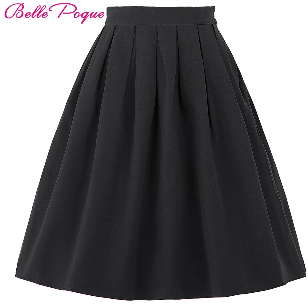 Beste Kopen Belle Poque Vrouwen jupe 2018 Zomer Katoen Hoge Taille Womens kantoor Vintage Geplooide Midi Rokken Zwart Rood Skater Korte Mini rok Goedkoop